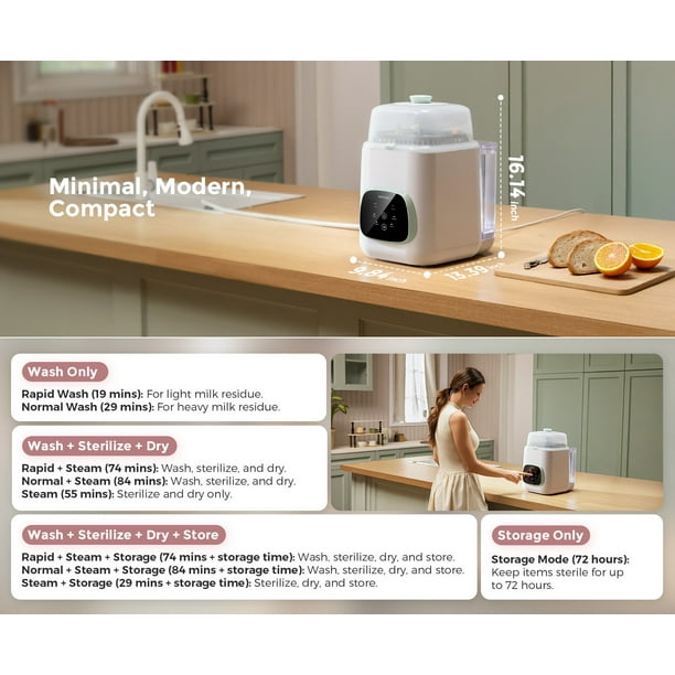 • 9 Cleaning Modes to Choose From: Freely combine the four modes (Rapid Wash, Normal Wash, Sterilize+Dry, Storage) and customize your settings. In a rush? Opt for the Quick Wash mode, which efficiently cleans your bottles in just 19 minutes.