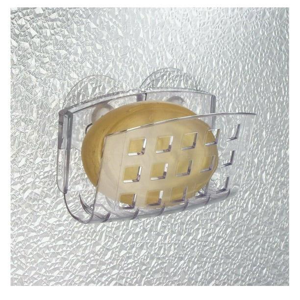 This durable, clear plastic soap dish features holes in the bottom for drainage and suction cups for secure adhesion to bath tiles.