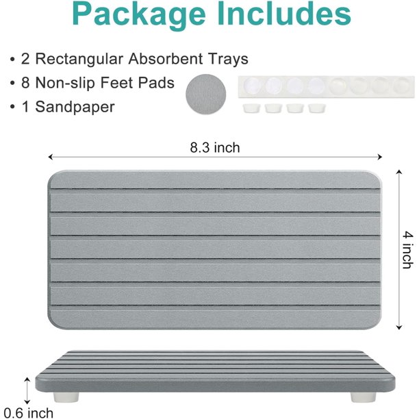 • SET OF 2 DRYING TRAYS: 2 piece dry sink slabs of 8.7″L x 4″W. The instant drying soap caddy can accommodate your hand soap, dish soap, cups, make-up bottles, toothbrush holder and dish sponge perfectly.