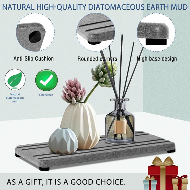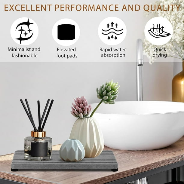 Quick Water Absorption and Fast Drying — Our fast drying stone sink tray is made from natural diatom mud and plant fibers,the small pores in diatomaceous earth give it amazing water absorption.They can absorb water and dry out in a few minutes.This water absorbing stone makes the bathroom countertop more dry and tidy.