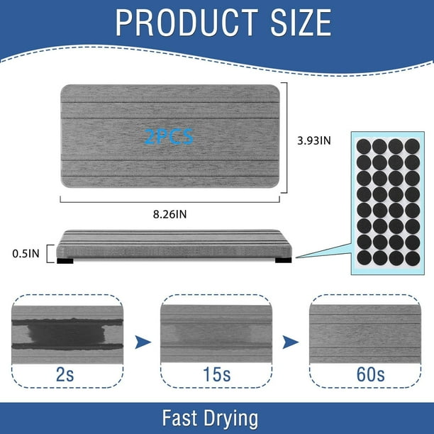 Perfect Size & 3-pieces — Our water absorbent diatomite tray are thicker and larger than other products. Packaging Includes: 1 piece pad of 8.27 inches * 3.94 inches * 0.5 inches (21 cm * 10 cm * 1.25 cm); 2 pieces pads of 3.94 inches * 3.94 inches * 0.5 inches (10 cm * 10 cm * 1.25 cm);Silicone anti slip pad * 32; 2 pieces of sandpaper.They can meet your different needs.