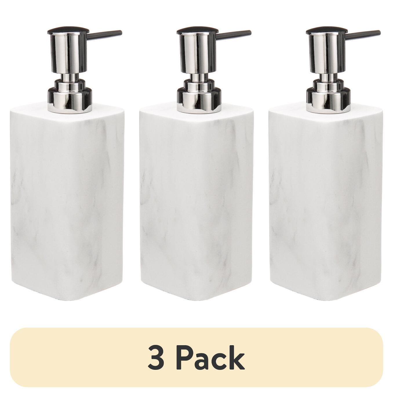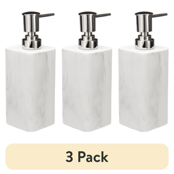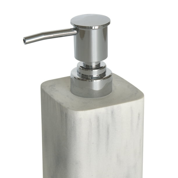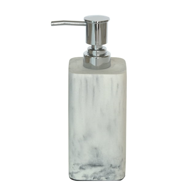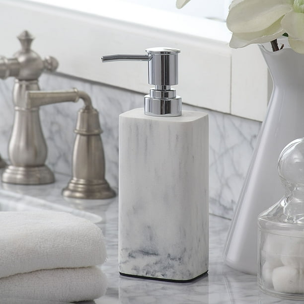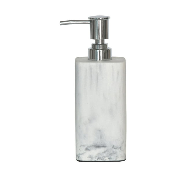 The Better Homes & Gardens Faux Marble Soap Pump features a classic white marble look for your countertop. Cast from a smooth, durable resin composite, which looks and feels like heavy white marble with veining, this dispenser can be used with liquid soap or lotion. It has a sleek, chrome finish pump top for easy use. The faux marble finish adds elegant style to any bathroom setting and will stand the test of time. Fill this soap pump with 13.8 ounces of your favorite liquid soap or hand lotion.