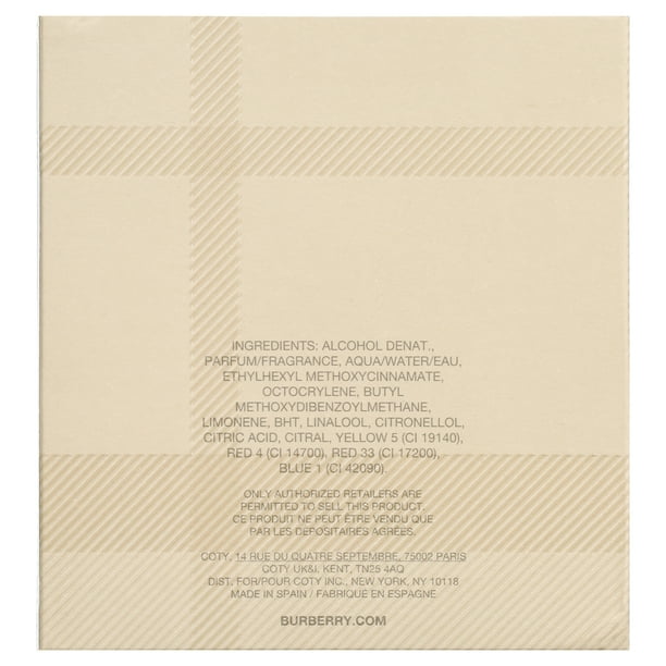 Burberry Eau de Parfum, Perfume For Women, 3.3 Oz. The Burberry woman is simple and charming, she loves the City she lives in and enjoys the long walks in the streets of London. Perfume is made in striking minimalist design. It starts with succulent and fresh burst of fruits; peach, apricot, cool pear and black currant. The heart is woody-floral; composed of clear and sharp notes of jasmine gently harmonized with the notes of sandalwood and cedar. The drydown is made of musk and vanilla. The perfume was created by Michel Almairac in 1995.