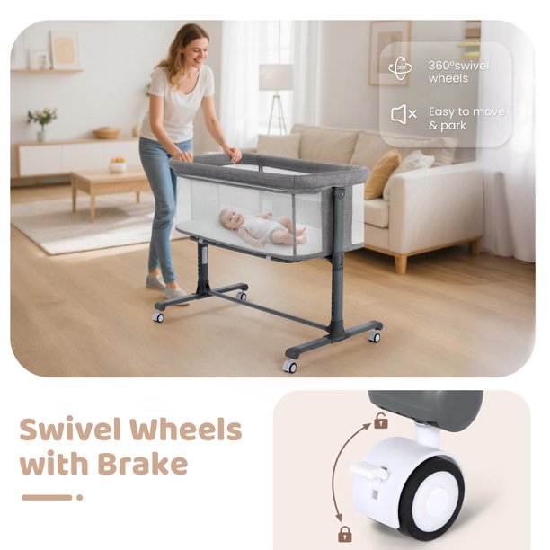 AILEEKISS Baby Bassinet with Wheels, Height Adjustable Newborn Bedside Sleeper for Baby, Grey