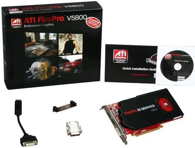 ATI FirePro V5800 professional graphics cardInstallation CD with drivers and documentationQuick Start Reference GuideOne DP to DVI (single-link) adaptersOne DVI to VGA adapterOne ATI CrossFire Pro connection cable