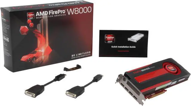 AMD FirePro® W8000 is the high-end category leader for multitasking and application performance across up to four displays. It’s up to 4.5 times faster than the competing solution in single precision compute performance due in part to its innovative, all-new Graphics Core Next (GCN) architecture. For 3D workloads, its GeometryBoost feature makes quick work of triangles, processing 1.8 billion per second – up to 1.5 times more than the competing product. Equipped with a large 4GB GDDR5 frame buffer, the W8000 delivers up to 1.5 times more memory bandwidth than the competing solution, and with high performance computing (HPC) features like error correcting code (ECC) memory and 806 GFLOPs of double precision floating point performance, it’s a great choice for HPC workflows. Drive up to four displays with AMD Eyefinity technology, and up to six utilizing DisplayPort 1.2 multistreaming technology, enabling users to multitask across multiple applications with ease Operates at resolutions well beyond standard HD, at a max of 4096 x 2160, thanks to DisplayPort 1.2 support 3.23 TFLOPs of single precision compute performance for unrivaled application performance – up to 4.5 times more than the competing solution Optimizations and certifications for many major CAD/CAE and media and entertainment applications Intelligent power saving and monitoring technologies for higher performance AMD Eyefinity Technology With this revolutionary multidisplay technology, the AMD FirePro W8000 graphics card can drive up to four independent displays with a single card, delivering a highly immersive and unrivaled multitasking experience. GeometryBoost Allows the GPU to process geometry data at a rate of twice per clock cycle resulting in a doubling in the rate of primitive and vertex processing. Triangle rates increase two-fold relative to a GPU that does not possess GeometryBoost. Error Correcting Code (ECC) Memory Helps ensure the accuracy of your computations by correcting single or double bit errors as a result of naturally occurring background radiation. Partially Resident Textures (PRT) PRT can utilize absolutely enormous texture files, up to 32TB large, with minimal performance impact. PRT accomplishes this by streaming small bits of these massive textures into the GPU as needed, giving compatible applications a virtually endless supply of unique texture data. Framelock / Genlock Facilitates synchronization to external sources (Genlock) or synchronizes 3D rendering across multiple GPUs in different systems. Energy-Efficient Design AMD ZeroCore Power technology leverages AMD’s leadership in notebook power efficiency to grant our desktop GPUs the ability to power down when your monitor is off, also known as the “long idle state.” AMD PowerTune AMD PowerTune is an intelligent system that performs real-time analysis of applications that utilize a GPU. In the event that an application is not making the most of the power available to the GPU, AMD PowerTune can improve that application’s performance by raising the GPU’s clock speed by up to 30% – automatically. AMD ZeroCore AMD ZeroCore Power technology leverages AMD’s leadership in notebook power efficiency to grant our desktop GPUs the ability to power down when your monitor is off, also known as the “long idle state.” Applications Specifications Memory Size/Type: 4GB GDDR5 Interface: 256-bit Bandwidth: 176GB Compute Performance 3.23 TFLOPs single precision and 806 GFLOPs double precision floating point performance Error Correcting Code (ECC) memory support Display Outputs DisplayPort: Four standard Max DisplayPort 1.2 Resolution: 4096×2160 Max DisplayPort 1.1 Resolution: 2560×1600 API, Features, & OS Support DirectX® 11.1 OpenGL 4.2 OpenCL® 1.2 Shader Model: 5.0 AMD Eyefinity Technology Support: Yes AMD CrossFire® Pro Support: Yes AMD HD3D Pro Support: Yes (via stereoscopic 3-pin mini DIN) OS Support: Microsoft® Windows® 8, Windows® 7, Windows® XP, Windows Vista® and Linux® (32- or 64-bit) Cooling, Power, & Form Factor Max Power: <225W Slots: Two Form Factor: Full height / Full length Bus Interface: PCIe® x16, 3.0 for optimal performance Cooling: Active fan System Requirements Available PCI® Express x16 (dual slot), 3.0 for optimal performance A power supply and two PCIe® AUX power connector (6-pin) 2GB system memory Microsoft® Windows® 8, Windows® 7, Windows® XP, Windows Vista® and Linux® (32- or 64-bit) Internet connection for driver installation Retail Package Contents AMD FirePro® W8000 workstation graphics card Quick Start Reference Guide AMD CrossFire® Pro connector Two DisplayPort to single-link -DVI (active) adapters Warranty and Support Three-year limited product repair / replacement warranty Direct toll free phone and email access to dedicated workstation technical support team Advanced parts replacement option What's in the Box