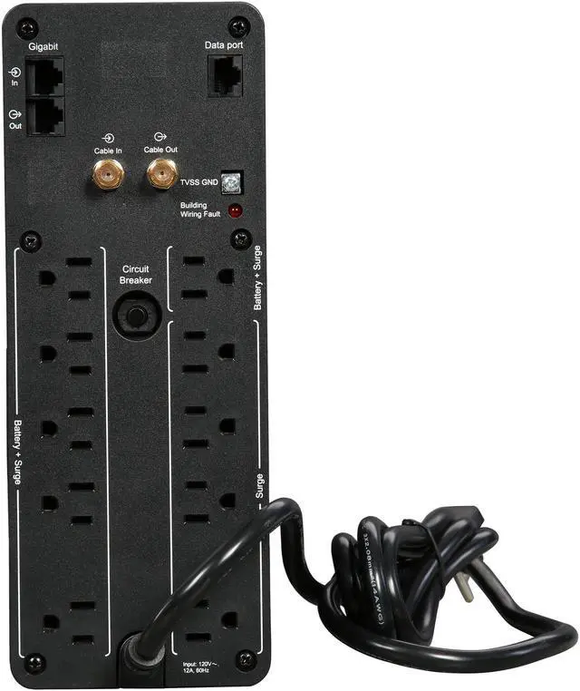 Boost Automatic Voltage Regulation (AVR): Preserves battery life and maximizes runtime by correcting low voltages without discharging the battery.Green mode: Patent-pending operating mode that bypasses unused electrical components in good power conditions to achieve very high operating efficiency without sacrificing any protection.Energy Management Function: Energy saving feature automatically power off peripherals when the a master device ,usually a PC ,hibernates or is shut down. Power to peripherals is immediately restored when the master device wakes up or is switched on.LCD Status Display: Provides key UPS status at a glance. Multiple status indicators with load and battery bar graphs.Battery-protected and surge-only outlets: Reserves power capacity and run time for connected equipment that require UPS battery back-up while providing surge only protection for less critical equipment. |