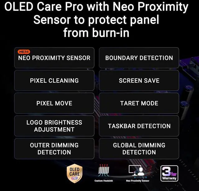 The ROG Strix OLED XG27UCDMG is a 27-inch, 240Hz 4K gaming monitor that boasts the latest fourth-generation QD-OLED technology to deliver supersharp visuals and crisp text. The cutting-edge QD-OLED panel offers greater longevity compared to previous OLED technologies and minimal flicker?even when frame rates fluctuate. With the addition of the Neo Proximity Sensor in the new ROG OLED Care Pro suite, the monitor transitions to a black screen when no user is detected, guarding against burn-in.