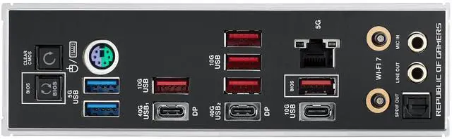 2 x USB4® (40Gbps) ports (2 x USB Type-C®)6 x USB 10Gbps ports (5 x Type-A + 1 x USB Type-C®) 2 x USB 5Gbps ports (2 x Type-A)1 x Wi-Fi module1 x Realtek 5Gb Ethernet port1 x PS/2 keyboard/mouse combo port 2 x Gold-plated audio jacks1 x Optical S/PDIF out port1 x BIOS FlashBack™ button 1 x Clear CMOS button |