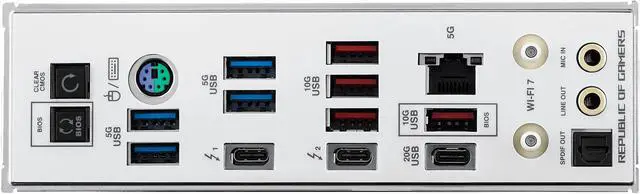 2 x Thunderbolt 4 ports (USB Type-C)1 x USB 20Gbps port (1 x USB Type-C)4 x USB 10Gbps ports (4 x Type-A)4 x USB 5Gbps ports (4 x Type-A)1 x Wi-Fi Module1 x Realtek 5Gb Ethernet port2 x Gold-plated audio jacks1 x Optical S/PDIF out port1 x BIOS FlashBack button 1 x Clear CMOS button 1 x PS/2 keyboard/mouse combo port |