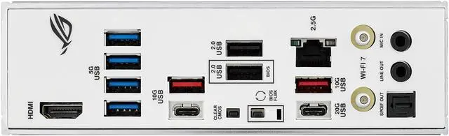 1 x USB 20Gbps port (1 x USB Type-C)3 x USB 10Gbps ports (2 x Type-A + 1 x USB Type-C)4 x USB 5Gbps ports (4 x Type-A)2 x USB 2.0 ports (2 x Type-A)1 x HDMI port1 x Wi-Fi module1 x Intel 2.5Gb Ethernet port2 x Audio jacks 1 x Optical S/PDIF out port1 x BIOS FlashBack button 1 x Clear CMOS button |