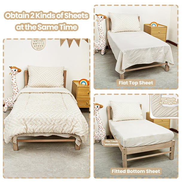 Beavtaens 4 Piece Toddler Bedding Set, Breathable and Soft Baby Sheet Set, Includes Quilted Comforter, Flat Sheet, Fitted Sheet and Pillowcase for Boys and Girls (White)