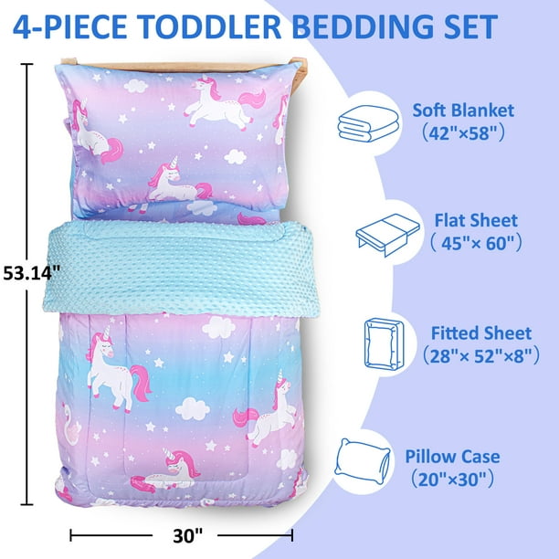 - Complete 4-Piece Set: Beavtaens toddler bedding set includes a quilt (42″x58″), a fitted sheet (fits 28″x52″ + 8″), a flat sheet (45″x60″), and a pillowcase (20″x30″).