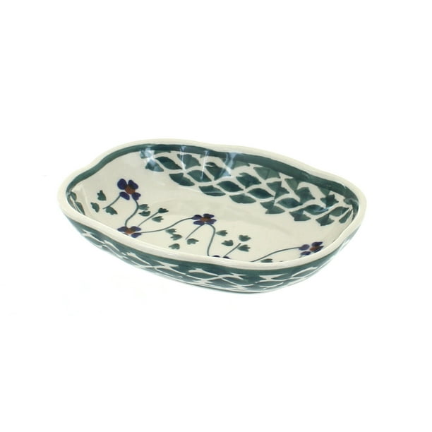 Pair our hand painted soap dish with your other pottery from our ceramic bathroom accessories line. Keep by the bathroom or kitchen sink! 5 inches long, 3.75 inches wide. The Art of Polish Pottery, as we know it today, started as local folk-art centuries ago in the German province of Silesia. The first known pieces of “Bunzlauer” stoneware dating back to the 16th century were crafted by hand and decorated with a folk-art stamping technique using potatoes. Original designs were inspired by the peacock feather using the colors of cobalt blue, sage green and ferrous red. These designs and colors are still the inspiration for modern day patterns. Today, skilled Polish artists still individually handcraft, and hand decorate each piece using small sponges to stamp each pattern and color. After the process of mixing ingredients, molding the pottery, applying the decorations and glaze, the pottery is twice fired. This process makes the pottery extremely durable; it will not crack or chip easily, and it is perfect for use in the microwave, dishwasher, oven, and freezer. Along with our pottery, we have sourced a range of absolutely beautiful hand-blown glassware from Poland. Blue Rose Pottery is the best place to start or add to your Polish Pottery collection!