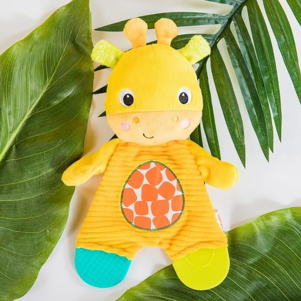 Giraffe comforts to babys uncomfortable teething time. The Snuggle & Teethe safari-themed plush toy from Bright Starts is made to soothe teething babies wherever they go. Baby will love the snuggly-soft fabric and captivating crinkles of this newborn toy. Not only is this toy fun to cuddle, but their feet double as teethers to help soothe aching gums. With this bright yellow giraffe buddy, things are only looking up, up, up! For infants ages 0 months and up.