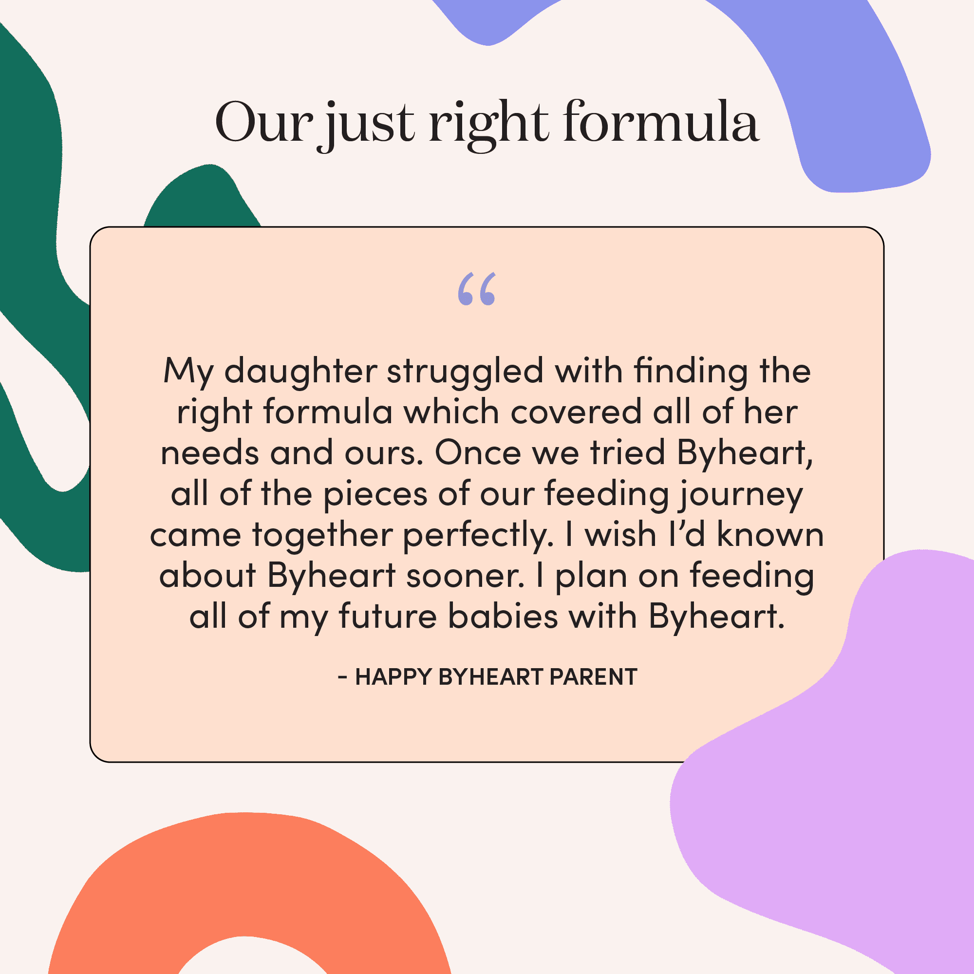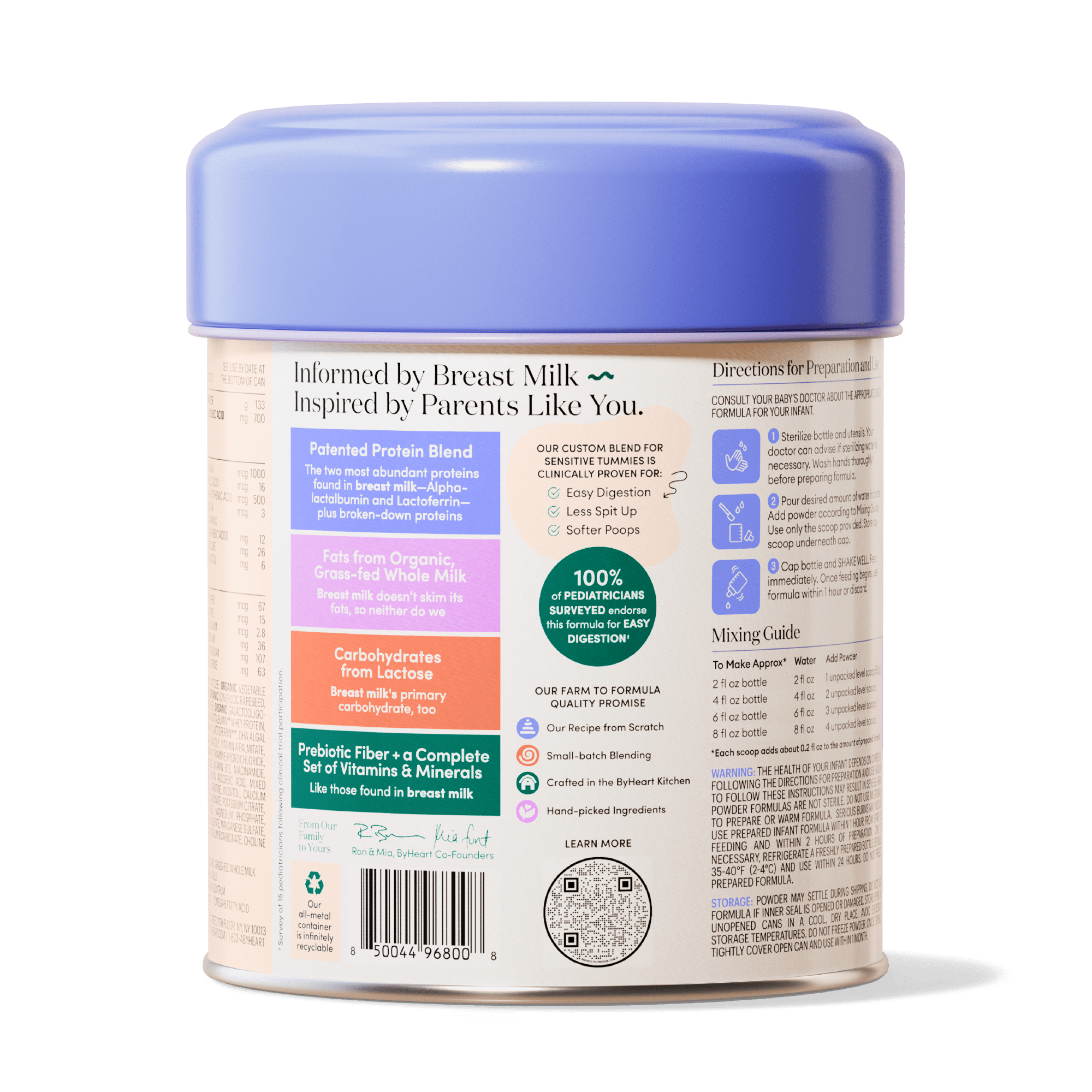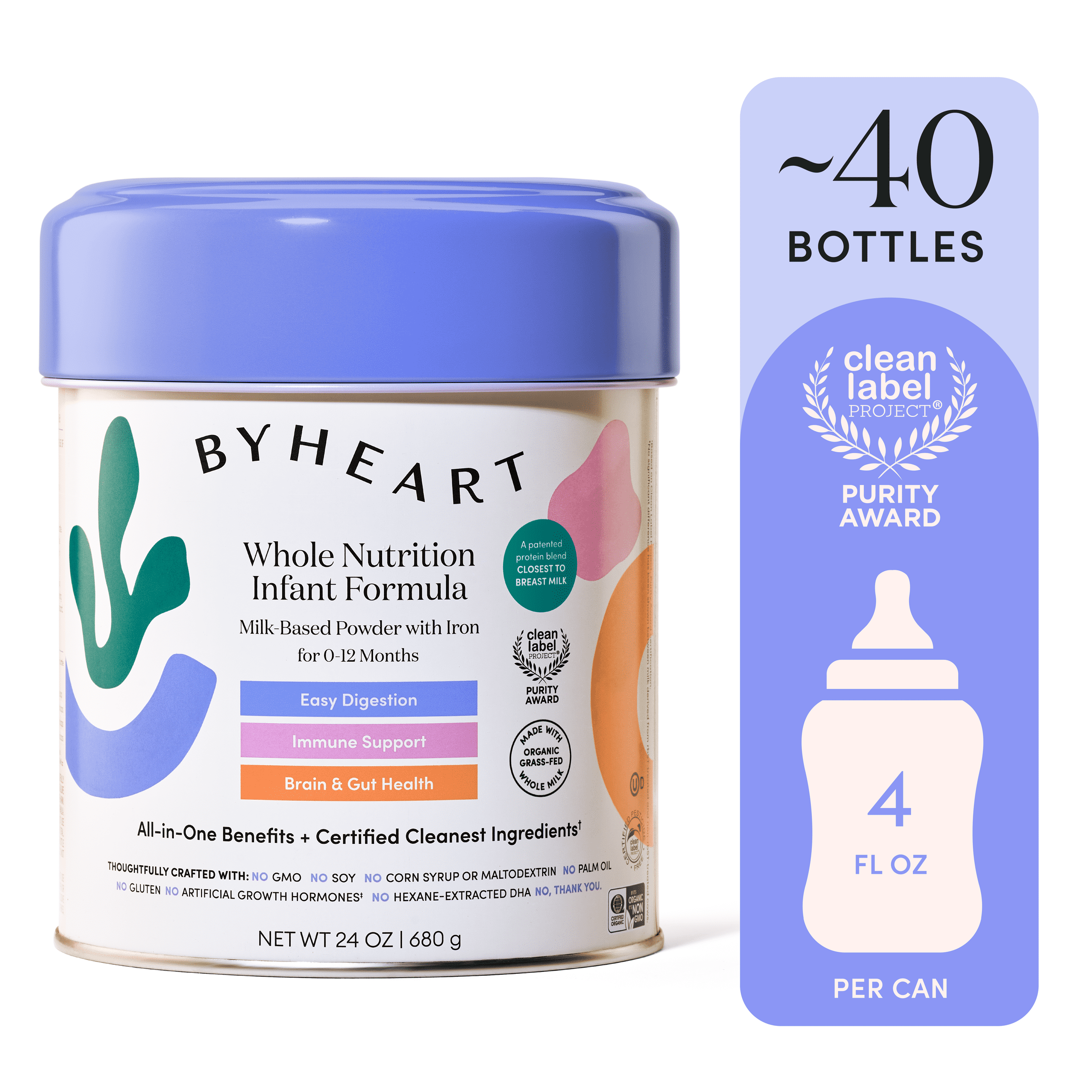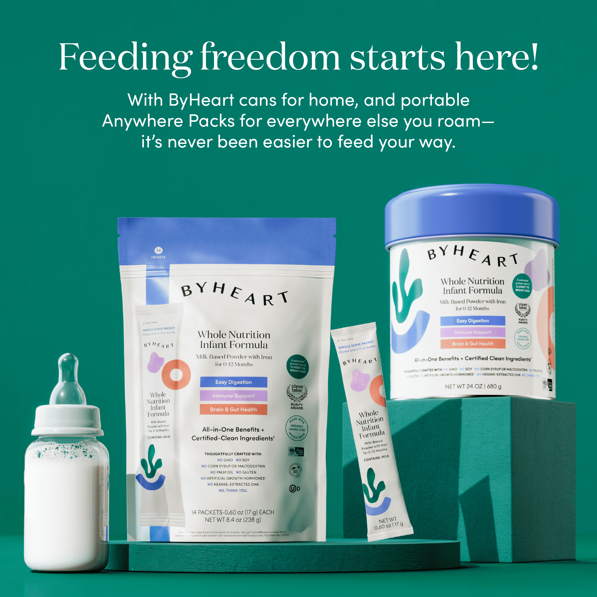 Meet ByHeart, an infant nutrition company built from the ground up to obsessively advance infant nutrition to nurture a healthier next generation (because the next generation deserves a formula built for theirs). Our goal? To bring clarity to infant nutrition, giving parents peace of mind in feeding, with a formula that doesn’t compromise. A formula that’s clinically proven*, with brain supporting benefits in every scoop, plus a patented protein blend that gets closest to breast milk. *Vs a leading infant formula. **No significant difference has been shown between milk ingredients derived from rbST-treated and non-rbST-treated cows.