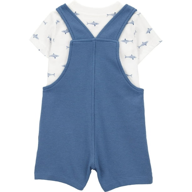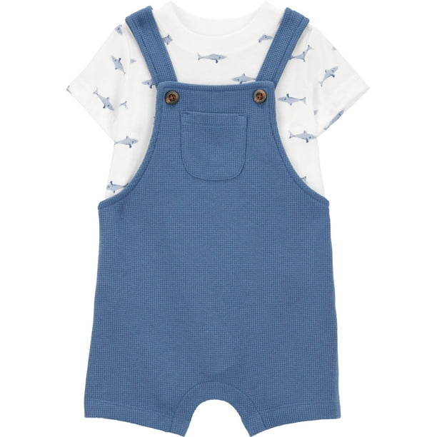 Dressed in a snap! This 2-piece overall set for baby boy from Carter’s Child of Mine is the perfect wardrobe must-have for little ones. This two-piece outfit includes one t-shirt and one pair of overall shorts to make getting baby dressed hassle-free! Plus, the overalls for baby boy feature snaps at the legs to make diaper changes easy, peasy! These shorts-style overalls and short sleeve t-shirt are perfectly comfy for warm weather days to keep baby cool and calm when you’re out and about! Each piece in this set is Standard 100 by OEKO-TEX so it’s certified clean for your little one.