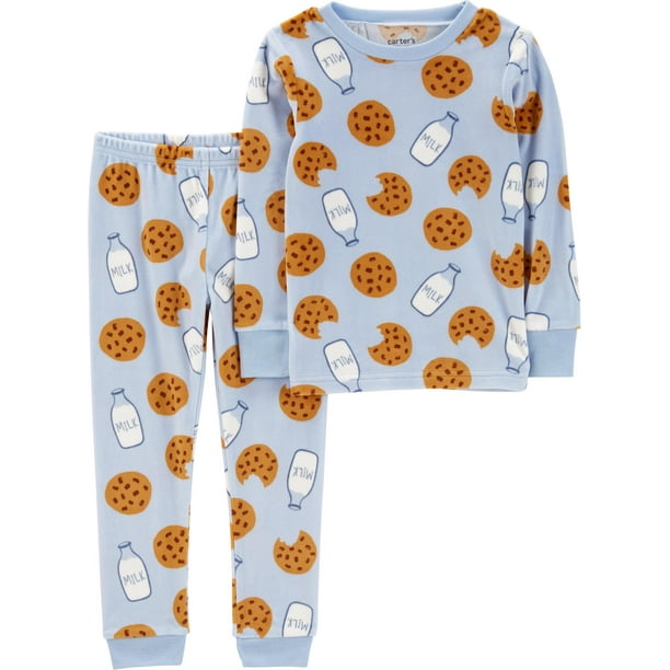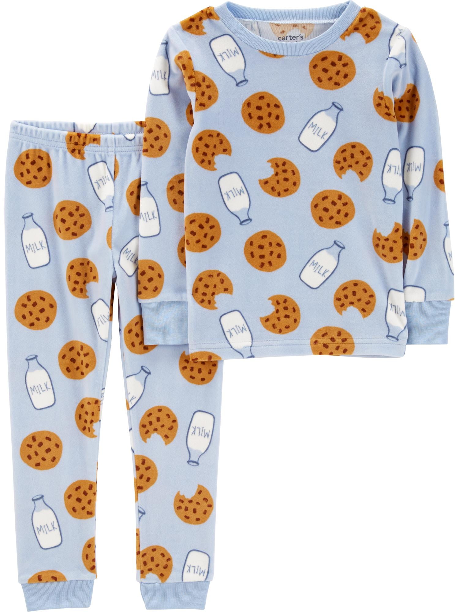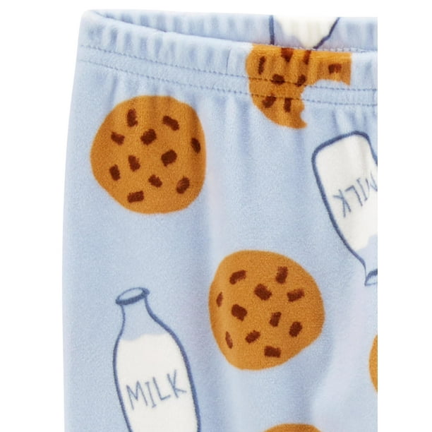 - Features: pajama top–crew neck, long sleeves, Light Blue with allover milk and cookies print; pajama pants–elastic leg openings, Blue with allover milk and cookies print