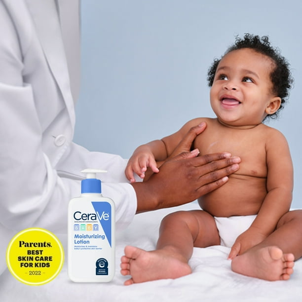 Developed with pediatric dermatologists, CeraVe Baby Moisturizing Lotion delivers soothing and moisturizing benefits for baby’s delicate skin while providing long-lasting hydration throughout the day. This non-greasy, lightweight baby lotion spreads easily on delicate skin to deliver three essential ceramides that help maintain the skin barrier as it develops. Enhanced with niacinamide, hyaluronic acid and vitamin E, our fragrance-free and paraben-free baby lotion locks in hydration throughout the day. Accepted by the National Eczema Association, this product is suitable for sensitive baby skin; eczema prone skin for babies’, toddlers’, and children’s face and body skin care.