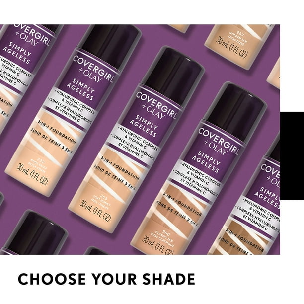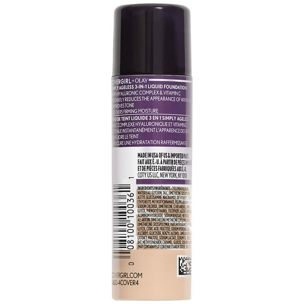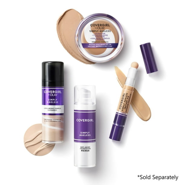 COVERGIRL meets Olay science with a product that instantly reduces wrinkles, evens skin tone and delivers firming hydration with the Simply Ageless 3-in-1 foundation. Instantly reduces the look of wrinkles. Delivers firming moisture. Improves tone.