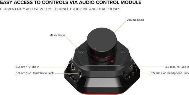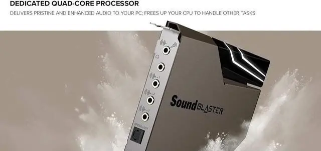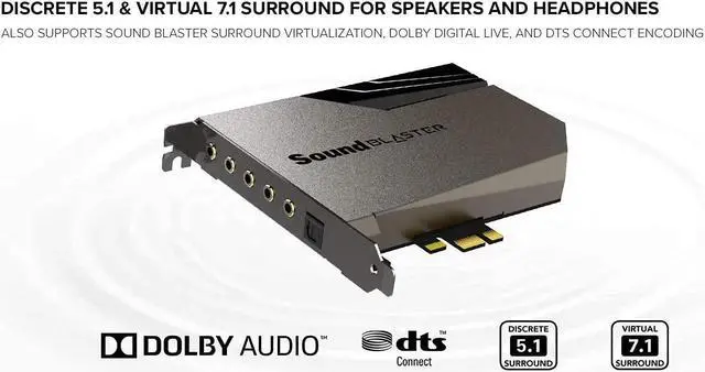 Hardware Accelerated AudioThe addition of AE-7 to your PC rig basically means one thing – you're adding in a dedicated quad-core processor designed with one goal in mind – to deliver incredibly pristine and enhanced sound on your PC without overstressing your CPU. Sound Blaster handles audio processing on the card itself ,freeing up your CPU to handle other tasks.Clean and Crisp Audio ClarityEnhanced audio is only going to sound as good as the components delivering it ,and with the AE-7 ,we're not pulling any punches. The AE-7 features an ESS SABRE-class 9018 DAC that delivers an incredibly clean 127dB DNR audio stream at up to 32-bit ,384 kHz PCM and DSD64 Playback. If pristine is at the core of your demand ,the AE-7 is going to blow past your expectations.Theatrical-Grade Discreet and Virtual SurroundWhether you are outputting to headphones or speakers ,the AE-7 is able to take stereo or multi-stream sources and transform them into immersive ,theatrical audio. It supports discrete 5.1 on speakers ,and up to 7.1 virtual surround on speakers and headphones. You can even switch effortlessly between headphones and your speakers for those times you want to pump the bass or go stealthier with your headphones.There's also Dolby Digital Live and DTS Connect Encoding for even more delivery options to your external audio devices.Audio Control ModuleTake easy control with the ACM that is incorporated with a built-in microphone array ,6.3 mm and 3.5 mm connectors for mic and headphones input and output connections. You can conveniently adjust the volume with the knob on the ACM – all within your fingertips. |