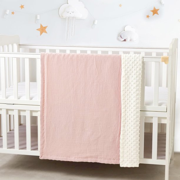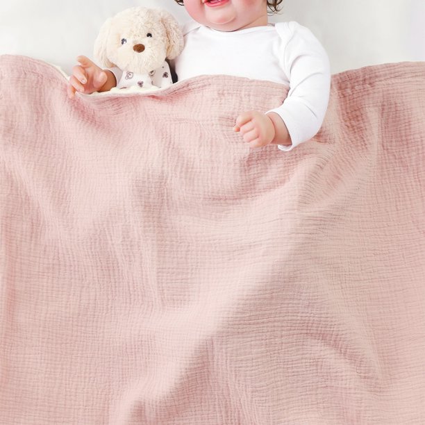CREVENT 30”X40” Organic Muslin Cotton Baby Blanket for Newborns, Soft Mink Backing, Essential for Baby Shower Birthday Gift – Pink 75X100cm