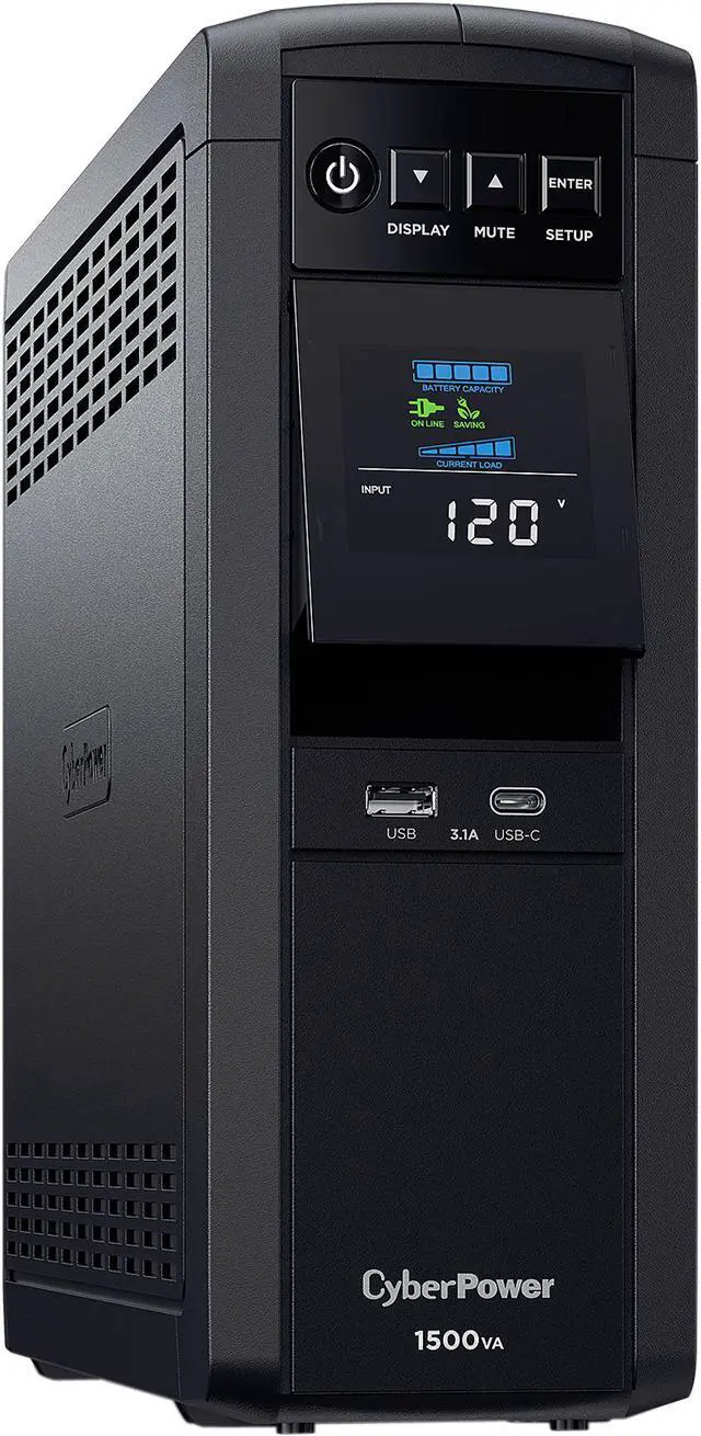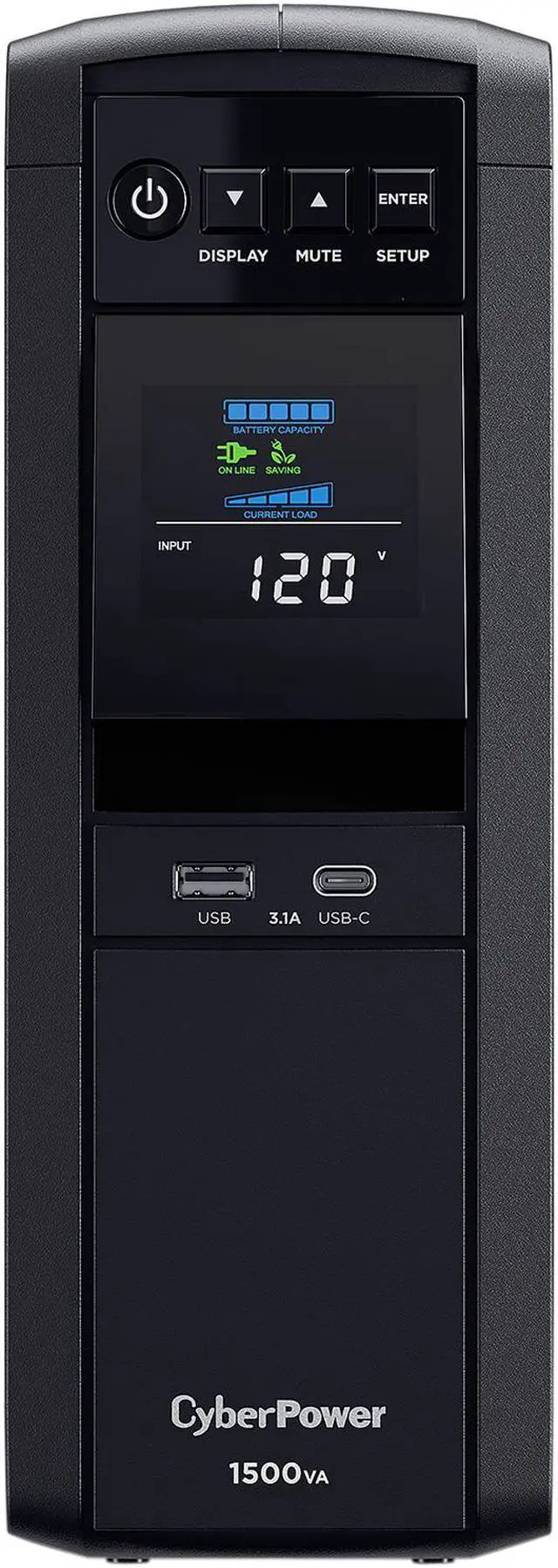 and home entertainment systems requiring active PFC power source compatibility.The CP1500PFCLCD features an advanced multifunction control panel with a color LCD to quickly confirm status and alerts at-a-glance. The screen tilts for easy viewing when the UPS is placed in a low position such as under a desk. Two USB charge ports (one Type-A and one Type-C) power portable devices such as mobile phones and tablets