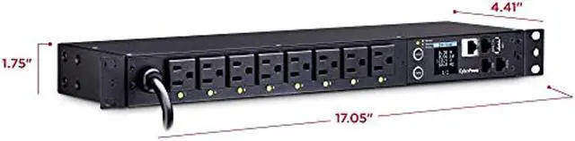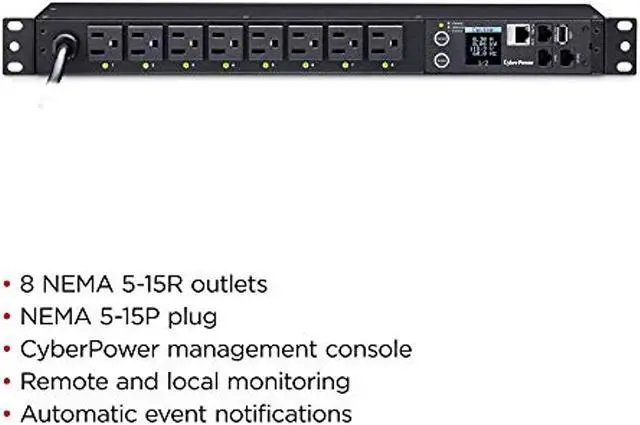 Switch-Free DesignSwitchable OutletsCyberPower Management ConsoleRemote and Local MonitoringAutomatic Event NotificationsUpgradeable FirmwareDigital DisplayNetwork-Grade Plugs and OutletsLong Input Power CordCord Retention TrayConfigurable Mounting BracketsDurable Metal Housing |