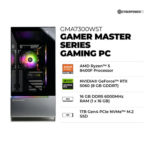 CyberPowerPC Gamer Master Gaming Desktop, AMD Ryzen 5 8400F, NVIDIA GeForce RTX 5060 8GB, 16GB DDR5, 1TB SSD, Black, GMA7300WST