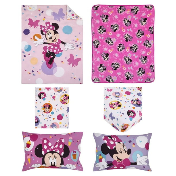 - Disney Minnie Mouse Having Fun 5-Pc Toddler Bedding Bundle Set includes a comforter, fitted bottom sheet, flat top sheet, reversible pillowcase and toddler blanket