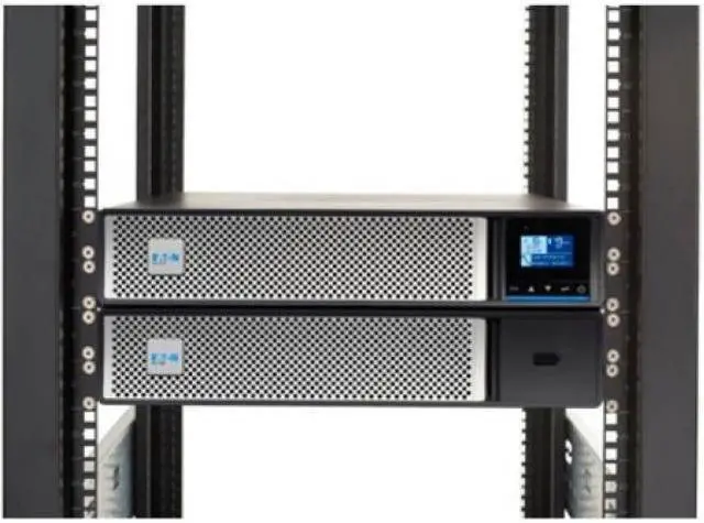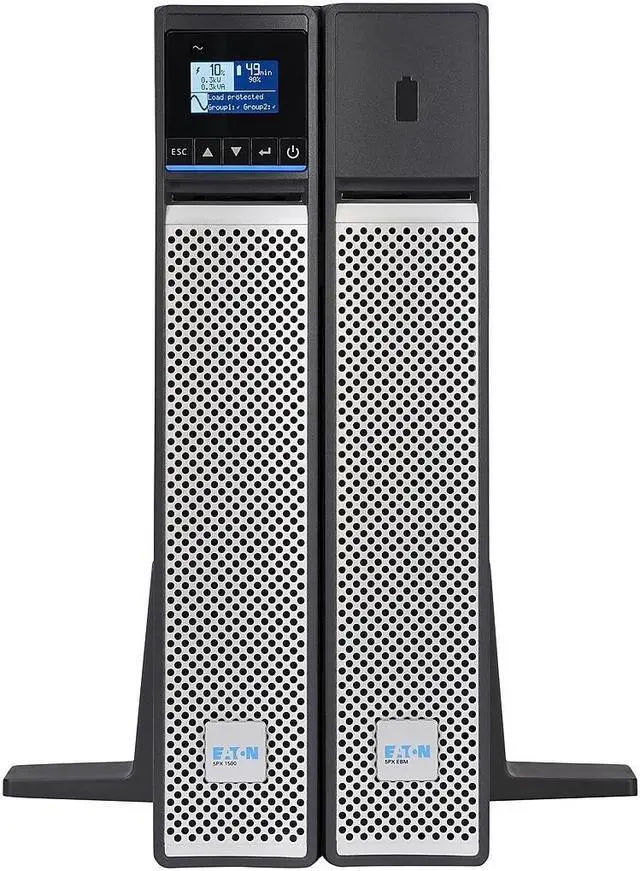 Eaton 5PX1500RTG2 5PX G2 1.4kVA/1.4kW/120V UPS The 5PX1500RTG2 UPS provides complete battery backup and power protection for servers, switches, data storage and other critical networking equipment, through eight managed 5-15R outlets. Compact in size, it supports both tower and rack installation. It enables ultimate ease of use, with rotating LCD display, LED status bar, and optional support for 24/7 remote access and automatic saves and shutdowns. Protects equipment against blackouts, brownouts, transient surges and line noise Keeps equipment running during outages to allow time for file saves and safe shutdown Unity power factor ensures maximum power possible at each power rating ENERGY STAR 2.0-certified to save electricity, lower costs and protect the environment Optional external battery modules allow extended runtime to keep equipment running Features 1.4kVA/1.4kW/120V Battery Backup for Distributed IT, Telecom or Enterprise Deployments This 5PX G2 rack-mount line-interactive UPS system provides reliable battery backup and AC power protection against blackouts, brownouts, surges and line noise that can damage your valuable IT equipment or destroy data. The 5PX1500RTG2 is ideal power management for small business, education, retail, financial or healthcare networking components, including servers, VoIP phones, data storage and PoE switches. Unity power factor ensures the most watts possible at each power rating, so you can connect more equipment. Reliable, Expandable Battery Backup Keeps You Operational Through Power Outages The field-replaceable, hot-swappable internal battery modules allow you to work through short power failures and give you enough time to safely save files and shut down your system in case of a prolonged blackout. Exclusive ABM technology increases battery life by 50 percent and closely monitors battery health to provide advanced notice when batteries need replacing. You can also connect up to four external battery modules (5PXEBM48RTG2, sold separately) for hours of extended runtime. Optional Gigabit Network Interface Offers 24/7 Remote Access The NETWORK-M2 network card (sold separately) enables full remote configuration and management, including load shedding, reboots of connected equipment and safe shutdowns. UPS firmware can also be flashed remotely through the NETWORK-M2 without dropping the load, so you don’t have to plan for downtime. The card meets both UL 2900-1 and IEC 62443-4-2 standards for cybersecurity, which were developed to address the vulnerability of connected devices to known malware/exploits and to protect business from these risks. An optional Environmental Monitoring Probe Gen 2 (EMPDT1H1C2, sold separately) provides a variety of environmental monitoring capabilities, including temperature and humidity conditions. NEMA 5-15R Outlets Protect Your Connected Components Eight managed 5-15R outlets provide connected equipment with pure sine wave AC output and allow you to monitor power consumption down to the outlet group level. Power provided by these outlets is filtered to protect connected equipment against damaging surges and line noise. Four outlets are grouped into two load banks that let you shed non-critical loads to extend runtime for critical loads. ENERGY STAR-Certified to Help You Save Money and Protect the Environment By meeting strict U.S. Department of Energy requirements, this ENERGY STAR 2.0 UPS system provides high operational efficiency to signal a reduction in BTU emissions, save on utility and cooling costs and help protect the environment. Rotating LCD Interface and LED Status Bar Keep You Informed at a Glance The high-contrast front-panel LCD provides detailed alarms and notifications to help diagnose any issues. The lower tri-color LED bar monitors UPS status: a blue light means all is well, a yellow light means your attention is needed, and a red light indicates a critical issue that demands immediate action. The interface rotates to accommodate both rack-mount and tower configurations. Advanced Communications Ports Allow for Automatic Saves and Shutdowns RS-232 and USB ports connect to a serial-enabled device for a variety of communication options (cables are included). A dry-contact relay port can be programmed through the LCD to provide reliable communications to automation and industrial components. The RPO/ROO port permits emergency shutdown or remote restart of all connected equipment. Versatile Installation Options You can mount the 5PX1500RTG2 in just 2U of space in an EIA-standard 19-inch rack using the included 4-post rail kit or an optional 2-post rail kit (103007018-5591, sold separately). At just 17.6 inches deep, the UPS mounts in short-depth racks and other compact spaces. You can also adapt it for tower installation using the included support stands. A ship-in-rack option enables integration into packaged deployments for simplified set up. The 10-foot power cord with NEMA 5-15P plug connects to a compatible AC outlet. PACKAGE INCLUDES 1440VA 1440W 120V 5PX G2 Line-Interactive UPS with 8 Outlets USB cable RS-232 cable Rack-mounting hardware Tower support stands Safety guide Quick Start Guide