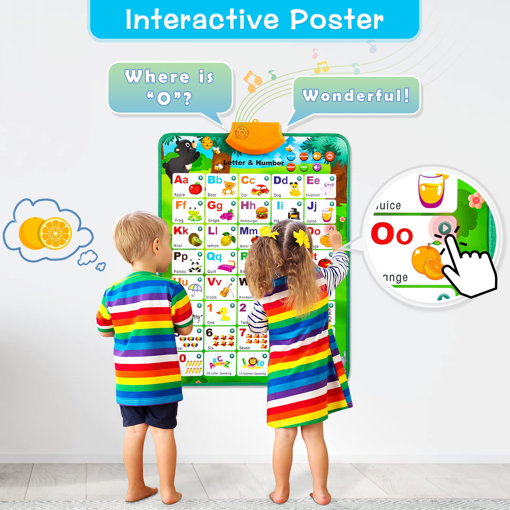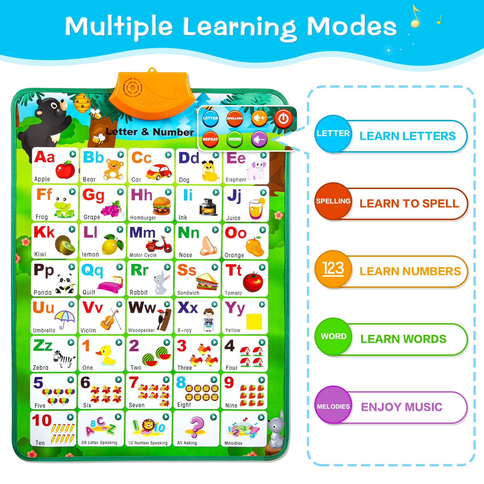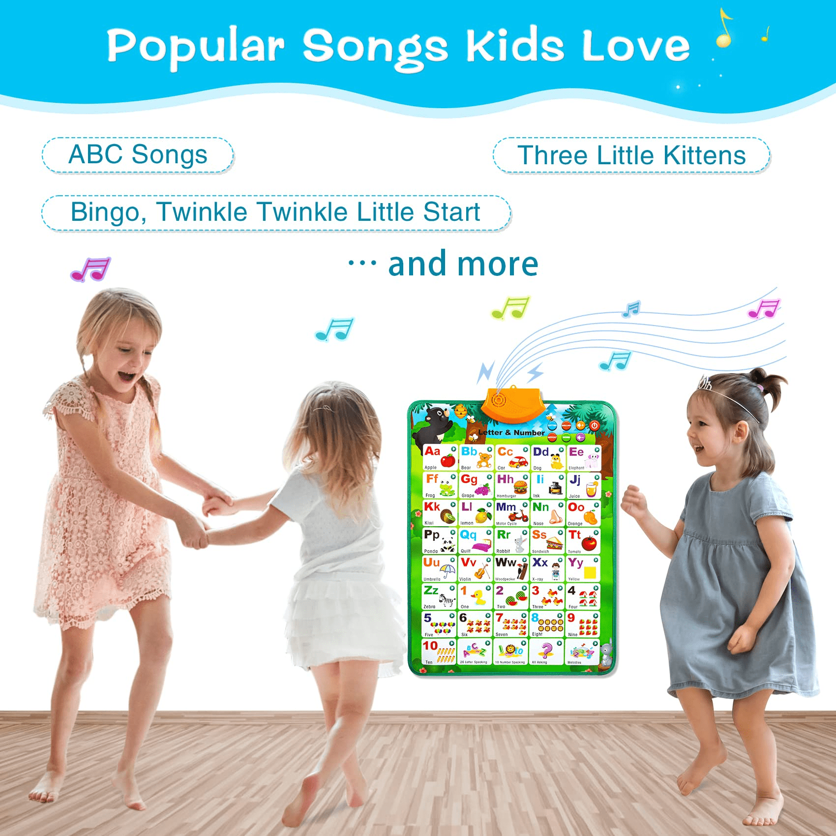 Boasting Quiz Game & Music modes and 10 popular English songs, this vibrant poster encourages activities like “find the letter” and “find the number.”