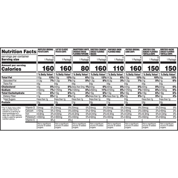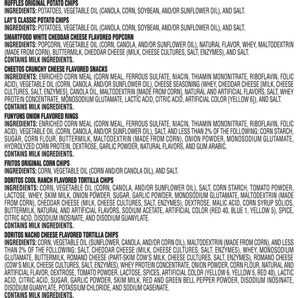- Includes Ruffles Original potato chips, Lay’s Classic potato chips, Smartfood White Cheddar flavored popcorn, Cheetos Crunchy cheese snacks, Funyuns onion flavored ring snacks, Fritos Original corn chips, Doritos Nacho Cheese and Doritos Cool Ranch flavored tortilla chips