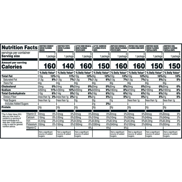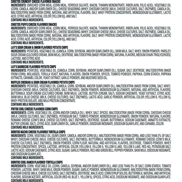 - Includes Cheetos Crunchy cheese snacks, Cheetos Puffs cheese snacks, Lay’s Sour Cream and Onion, Lay’s Barbecue flavored potato chips, Ruffles Cheddar and Sour Cream, Fritos Chili Cheese corn chips, Doritos Nacho Cheese, and Doritos Cool Ranch