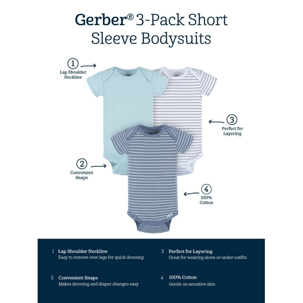 • Gerber Baby Neutral Short Sleeve Bodysuits, 3-Pack, Sizes Newborn – 24 Months