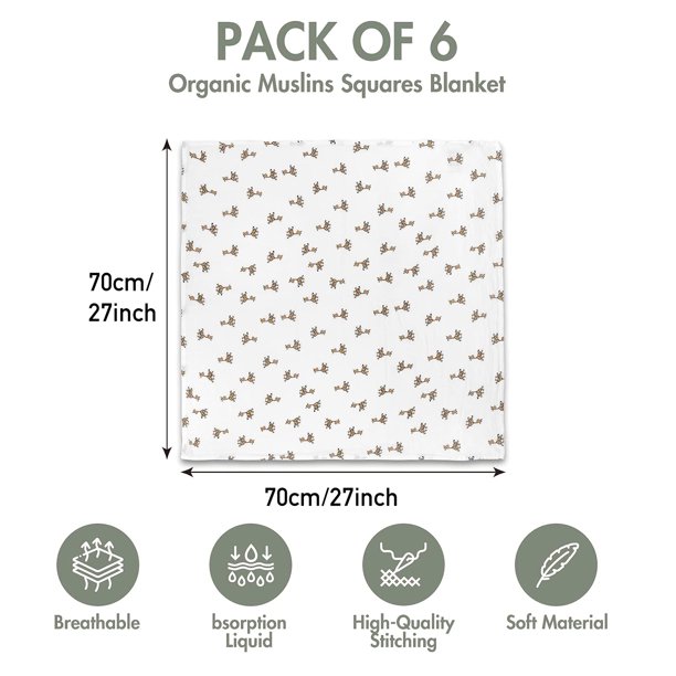 FOUR SEASONS USE & VERSATILE – Due to their practical size (70 x 70 cm, 6 packs), these baby blankets are used for a variety of purposes, such as receiving blanket, cuddle blanket, nursing cover, stroller sunshade, burp cloth, car seat cover, play mat, changing pad, mini crib sheet , face washer, spit-up catcher, picnics or tummy time blanket, and much more. Plus, they dry quickly, making them ready for reuse in no time and offering even more everyday convenience for parents.