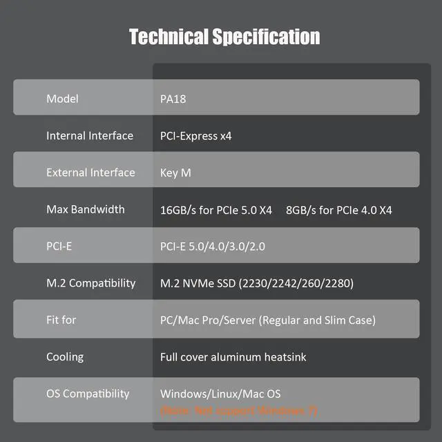 @import url(//c1.neweggimages.com/WebResource/Themes/WWW/CSS/seller/a_plus_content.css) @import url(//c1.neweggimages.com/WebResource/Themes/WWW/CSS/seller/a_plus_content_responsive.css) Model: PA18 Internal Interface PCI-Express X4 External Interface Key M Max Bandwidth 16GB/s for PCIe 5.0 X4 and 8GB/s for PCIe 4.0 X4 PCI-E Compatibility PCI-Express 5.0/4.0/3.0/2.0 M.2 Size 2230/2242/2260/2280 OS Compatibility Windows, Linux, Mac OS (Not support Windows 7)