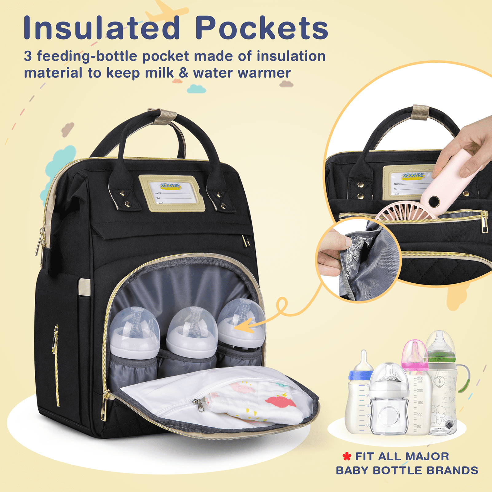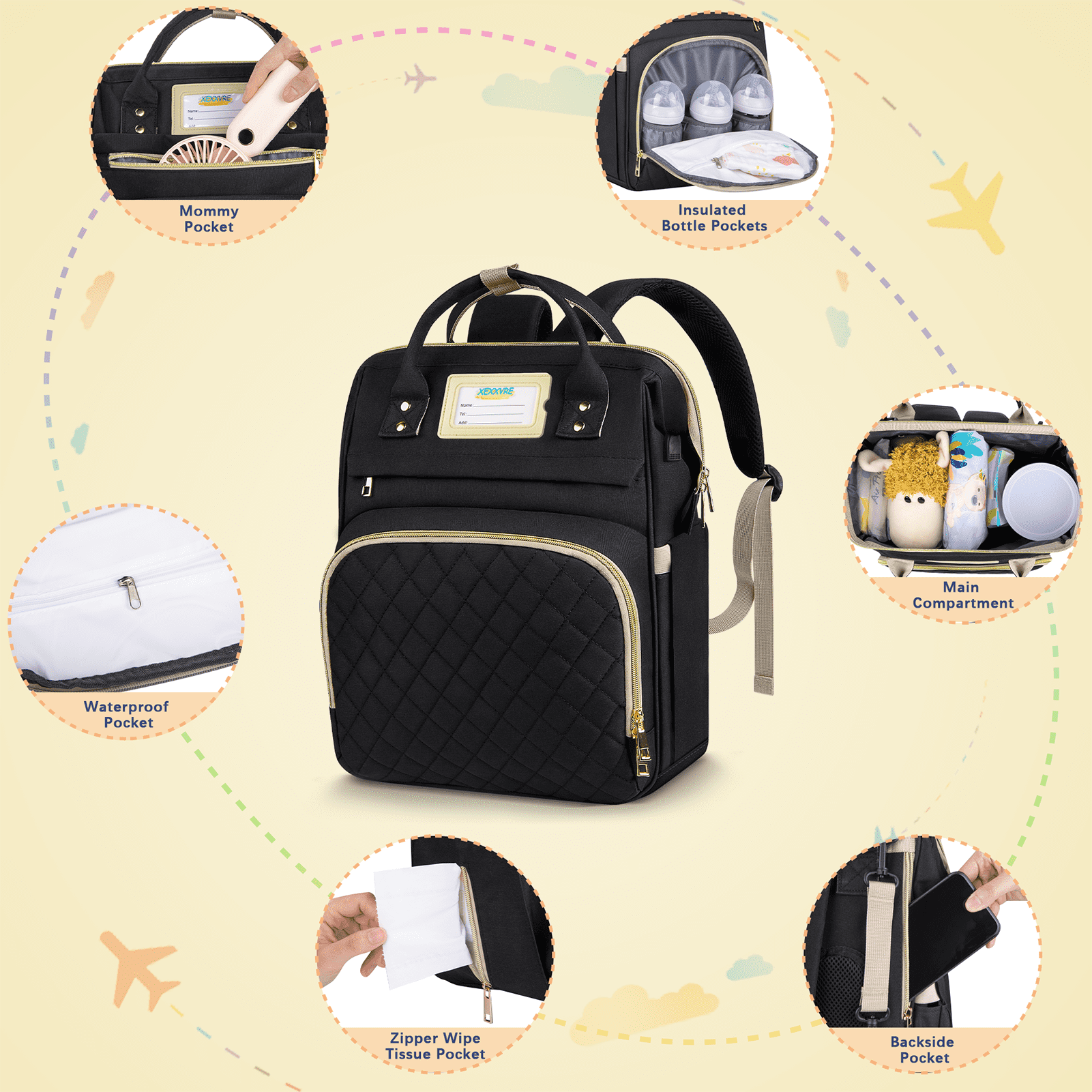 - 【Multifunctional Pocket Design】This baby bag for boys has 15 pockets, spacious enough to hold most baby essentials, and still looks organized and compact without being too big or too small. An anti-theft pocket on the back is designed for storing your phone, keys and cards. It has 3 foil insulated pockets to fit 3 baby bottles (5-11 oz) and keep them warm, and four elastic side pockets are perfect for storing wipes, diapers, bibs, and other baby toiletries.
