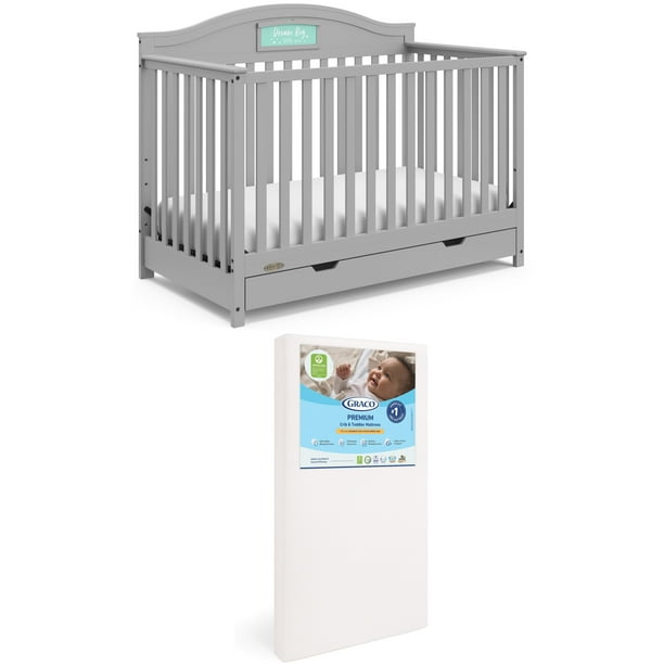 Graco Story Customizable 5-in-1 Convertible Crib with Drawer and Premium Crib & Toddler Mattress Bundle, Pebble Gray