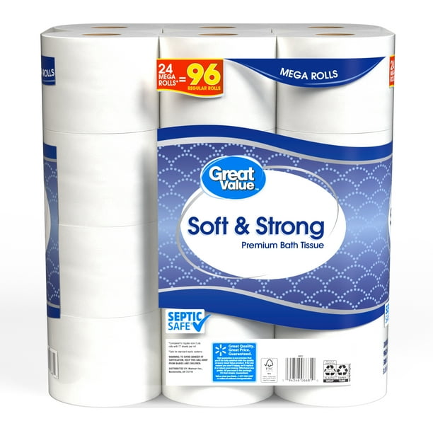 Great Value Soft & Strong Premium Toilet Paper features 2-ply sheets of toilet paper that are super strong and absorbent making it the perfect solution for all your bathroom needs. This premium toilet paper has the perfect combination of strength and softness. Providing effective cleaning while being gentle on your skin. This pack comes with 24 mega rolls making this pack the equivalent of 96 regular rolls, so it’s easy to stock up for you or your family. Great Value Toilet Paper is also safe for standard septic systems. Take care of your bathroom needs with Great Value Soft & Strong Premium Toilet Paper. Great Value products provide families with affordable, high quality grocery and household consumable options. With our wide range of product categories spanning grocery and household consumables, we offer you a variety of products for your family’s needs. Our products are conveniently available online and in Walmart stores nationwide, allowing you to stock up and save money at the same