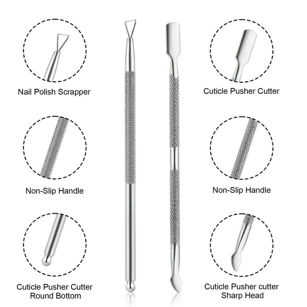 - The nail pusher scraper head can be used to scrape off soaked polish, and the sharp head can be used to cut or scrape away dead cuticle.