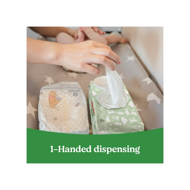 Huggies Natural Care Sensitive Baby Wipes are designed to help keep baby’s skin clean and healthy. Plant-based(70%+ by weight plant-based materials) and made with no harsh ingredients, Huggies Natural Care fragrance free wipes are hypoallergenic and dermatologist-tested and the pH-balanced wipe helps maintain healthy skin for your baby. They’re recognized by the National Eczema Association and they’re safe for sensitive skin and free of fragrance, alcohol, parabens and phenoxyethanol. With the #1 branded wipe, you can feel confident you are giving baby a safe, gentle clean. Huggies Natural Care unscented baby wipes, with Aloe and Vitamin E, provide a gentle clean for baby’s skin. These disposable baby wipes come in packaging with cute Disney patterns for a delightful touch that will fit in great on your changing table, in your diaper bag and wherever you need a wipe! Plus, with 1-Handed Dispensing, it’s easy to grab wipes with a single hand! (70%+ by weight) (Based on US Nielsen data ending 9/4/2021)