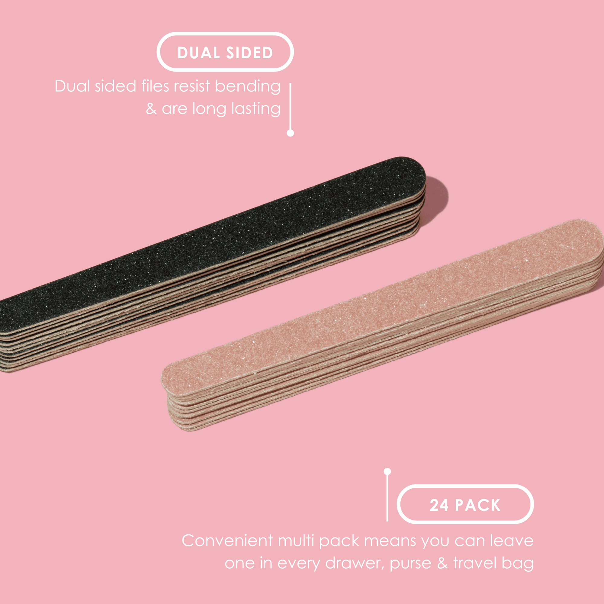 Japonesque’s 24 pack of Nail Files help keep your natural nails beautifully groomed. These boards are perfect for natural nails & are ideal for reducing length, shaping the edge, smoothing out snags, or filing down broken nails. These dual sided files resist bending & are long lasting. The convenient multi pack means you can leave one in every drawer, purse & travel bag.
