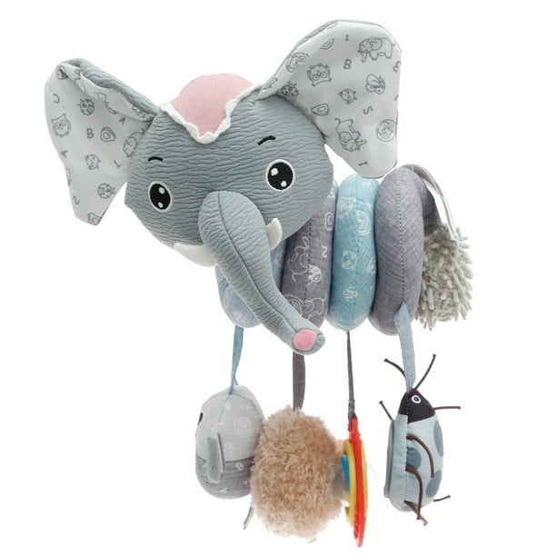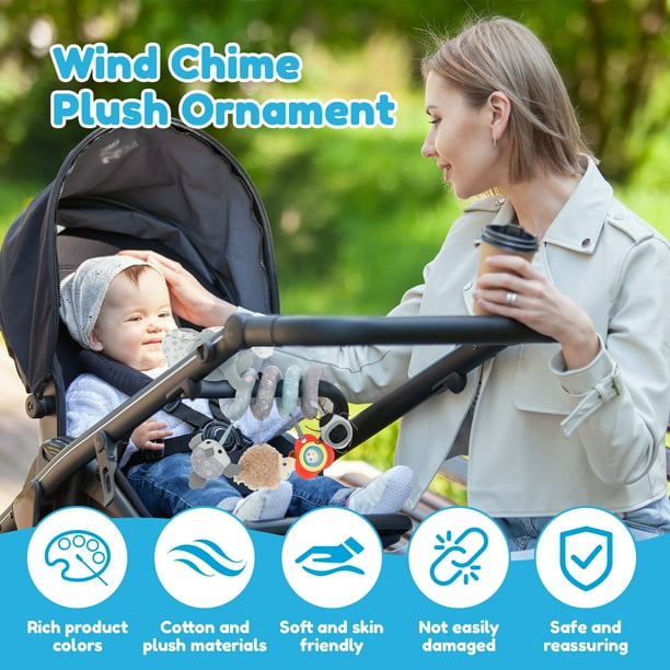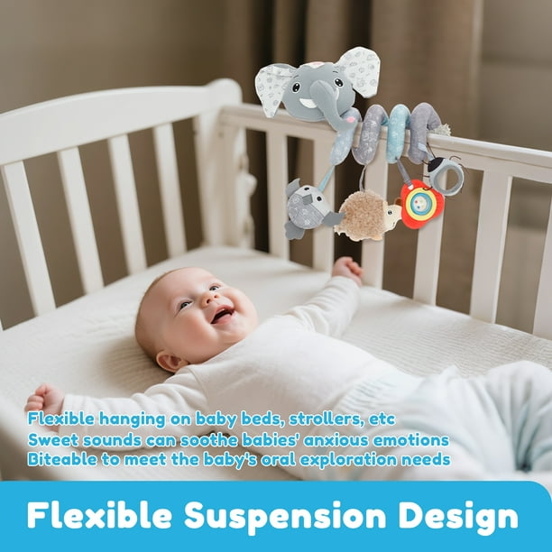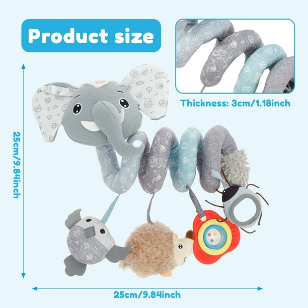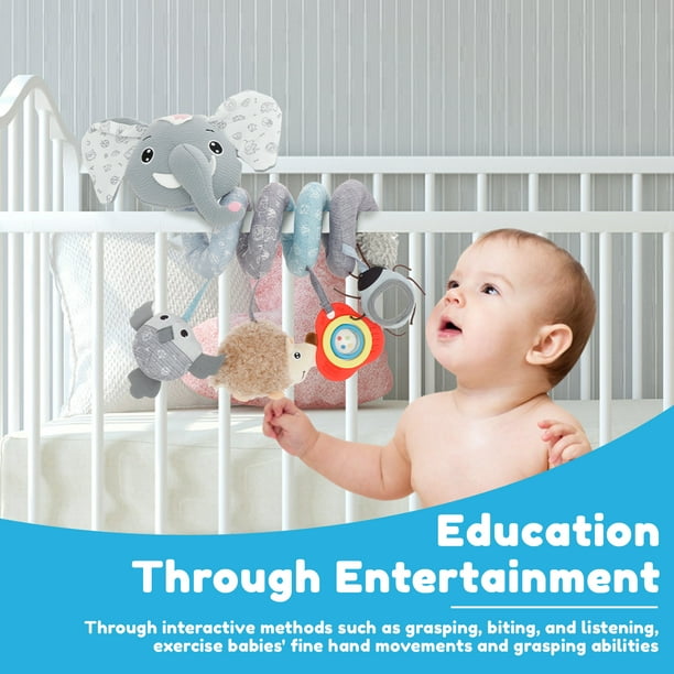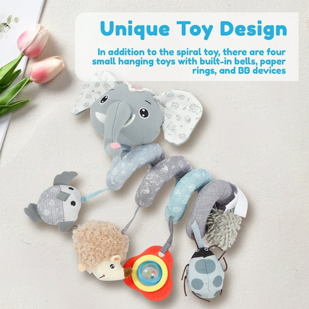 - Interactive Spiral Activity Toy: In addition to the spiral design, includes four hanging mini toys with built in bells, crinkle paper, and BB squeakers. Soothing sounds calm fussy babies, while music like tones aid auditory development. Teething friendly chew toys satisfy oral exploration needs