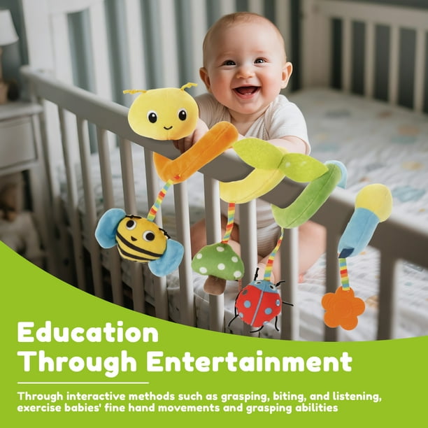 • Interactive Spiral Activity Toy: Besides the spiral toy, there are four small hanging toys with built in bells and BB squeakers that make pleasant sounds when shaken. Comes with a chewable teether to satisfy babies’ oral exploration needs