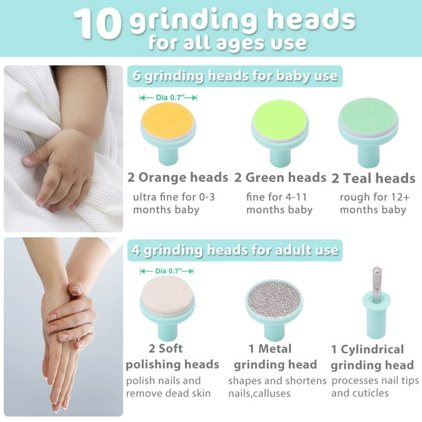 • 10 in 1 nail care kit FOR BABY AND MOM: Better than others, this baby nail file has 10 grinding heads. 6 colored sandpapers with 3 textures are designed for different stages of babies’ growth and various needs. Electric nail file also comes with 1 cylindrical grinding head and 1 metal grinding head for adults, 2 soft grinding heads for polishing. So the manicure set can be used for newborn, infant, toddlers, kids from 0 to 12 months or above. as well as adults.