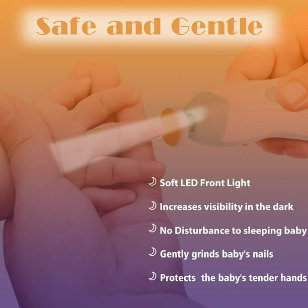 • LED FRONT LIGHT AND QUIET OPERATIONS: This baby nail file built in soft LED front light which will help you use it in the dark. The nail care kit equips with a whisper-quiet motor. You can conveniently trim toes and fingernails without waking up the sleeping baby. Even if the baby is awake, you won’t make any disturbance or afraid for him! Always enjoy a gentle manicure using this nail trimmer with CE , RoHS approval!