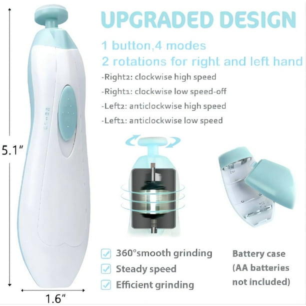 • EFFECTIVE, EFFORTLESS AND SAFE: The baby nail file is powered by 2 AA batteries (not included). Electric grinding with speed up to 5000 rev/min allows you to swiftly trim and polish both toenails and fingernails into desired shape. There is 2mm foam cushion under sandpapers so you are able to file little nails without harming surrounding skin. The safe nail grooming set won’t injure cuticles or soft nail beds. You and your baby will have a full healthcare in this electronic grooming kit.