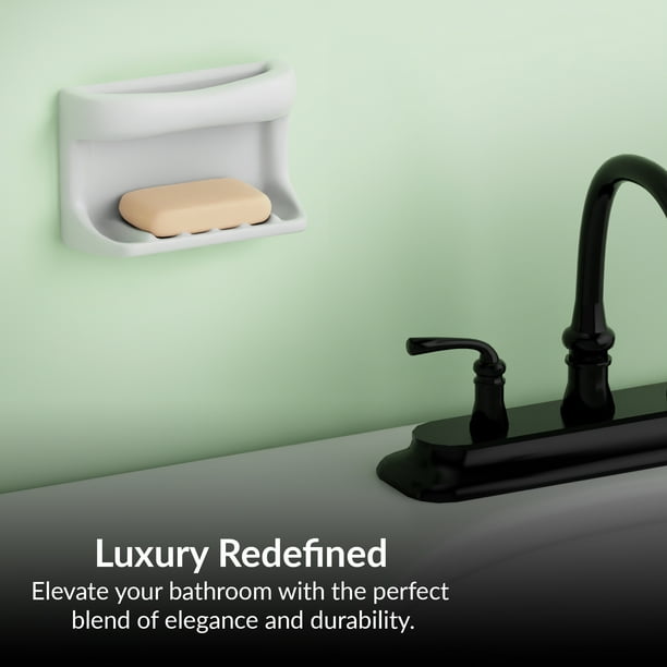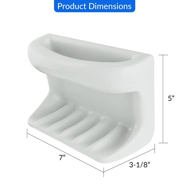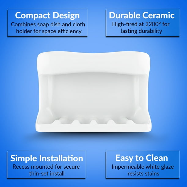 Enhance your bathroom remodel with our High-Fired White Ceramic Soap Dish with Cloth Holder. Crafted from durable, high-fired ceramic at 2200°F, this soap dish features a fully vitreous body that will never rust, fade, tarnish, or corrode. The impervious white glaze ensures long-lasting beauty and easy maintenance, as it can be effortlessly cleaned and sanitized with any disinfecting cleaner. Designed for a thin set installation, the soap dish has a back depth of 5/16″”, making it ideal for seamless integration into any ceramic tile project. The nominal overall dimensions are 5″” in height, 7″” in width, and 3 1/8″” in depth, while the wall opening dimensions measure 4″” in height, 6″” in width, and 5/16″” in depth. This recessed mounted fixture is simple to install and adds a touch of elegance to both large and small bathrooms. Backed by a lifetime warranty, this soap dish offers great value and reliability, making it a practical choice for any bath renovation” The nominal overall dimensions are 5″L (Vertical) x 7″W (Horizontal) x 3 1/8″H The nominal wall opening dimensions are 4″L (Vertical) x 6″W (Horizontal) x 5/16″D. High-fired ceramic Easy to clean Lifetime warranty Recess mounted; easy to install with ceramic tile installation Impermeable white glaze Great value