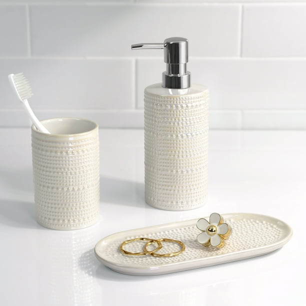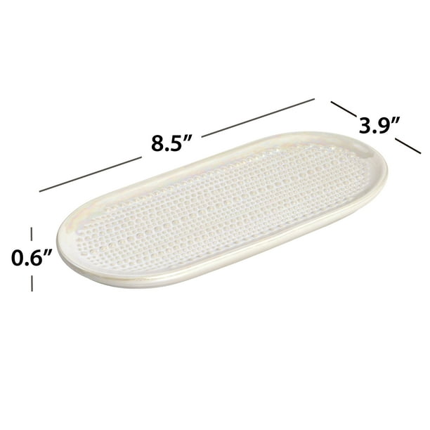 Infuse a feeling of refreshing vintage style into your bathroom with the Mainstays Pearlescent Tray. This embossed Tray is made of ceramic featuring an updated hobnail design in white with an iridescent pearlized finish. Use this versatile piece to display paper guest towels, store toiletries and other bath essentials or as a catch all for jewelry, hair accessories, cosmetics and more, keeping your countertop neat and organized. Dress your bathroom with this charming piece that will bring timeless elegance to your room. Hand wash. Complete the look by coordinating with other pieces in the Mainstays Pearlescent Bath Collection or use alone.
